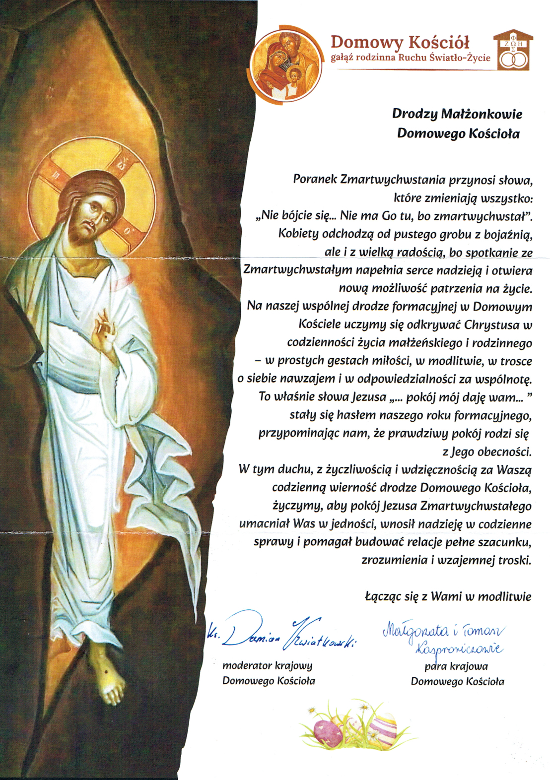 Właśnie tego, by z każdym dniem wzrastała wiara, nadzieja i miłość w naszych rodzinach i wspólnotach życzymy Wam kochani na te kolejne święta Wielkiej Nocy. Niech Jego pokój zawsze gości w waszych sercach.